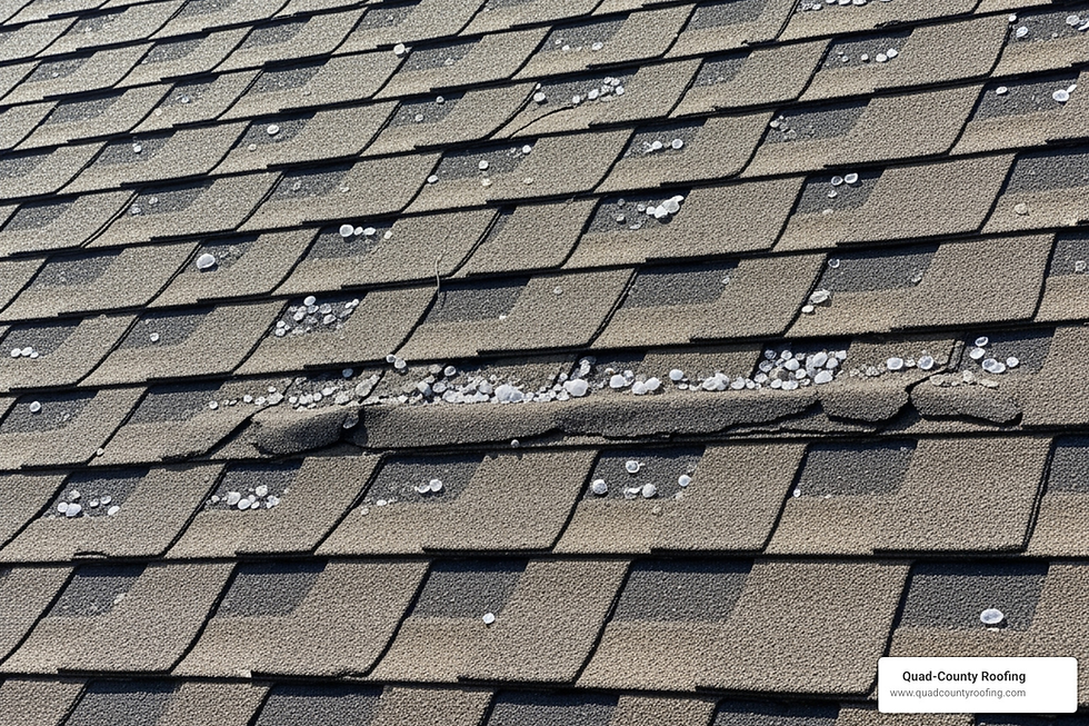 Hail: Hail can "bruise" shingles, knocking off the protective granules and leaving the asphalt mat exposed to UV rays and leaks.
